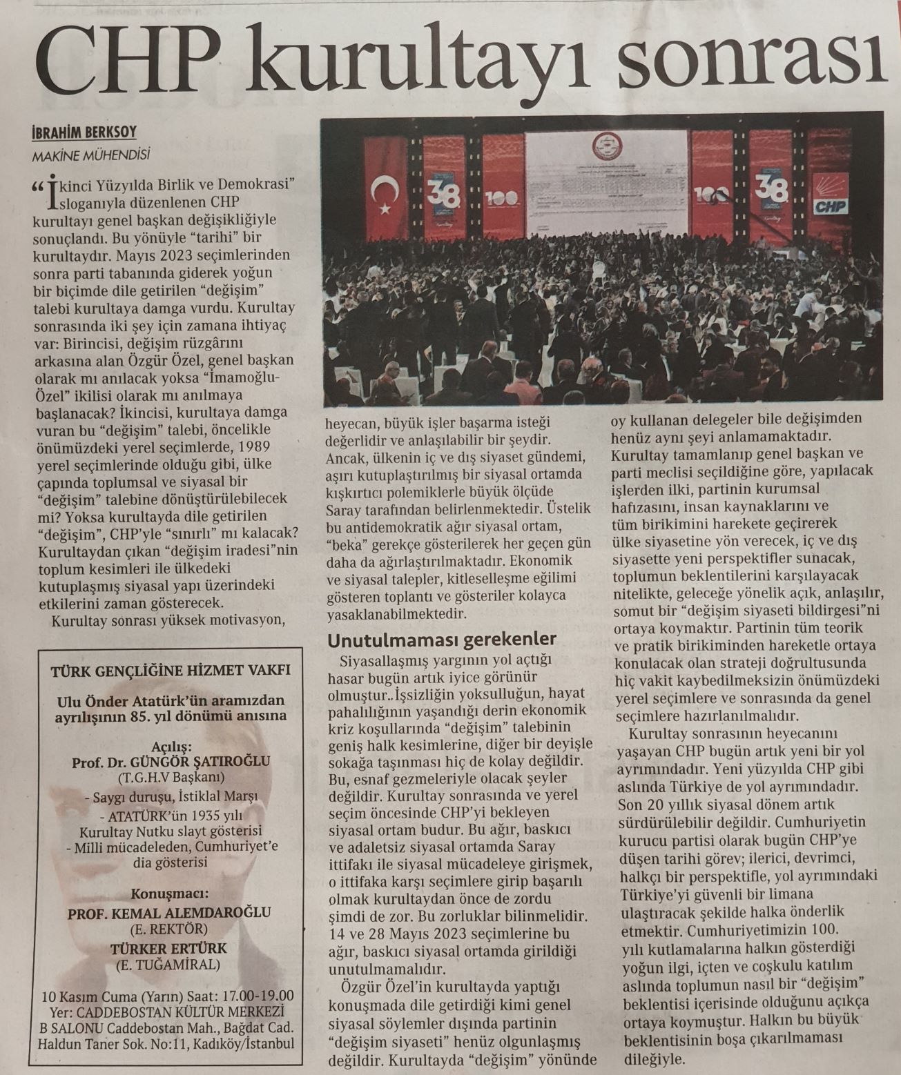 "Cumhuriyetin kurucu partisi olarak bugün CHP’ye düşen tarihi görev; ilerici, devrimci, halkçı bir perspektifle, yol ayrımındaki Türkiye’yi güvenli bir limana ulaştıracak şekilde halka önderlik etmektir. Cumhuriyetimizin 100. yılı kutlamalarına halkın gösterdiği yoğun ilgi, içten ve coşkulu katılım aslında toplumun nasıl bir “değişim” beklentisi içerisinde olduğunu açıkça ortaya koymuştur. Halkın bu büyük beklentisinin boşa çıkarılmaması dileğiyle."