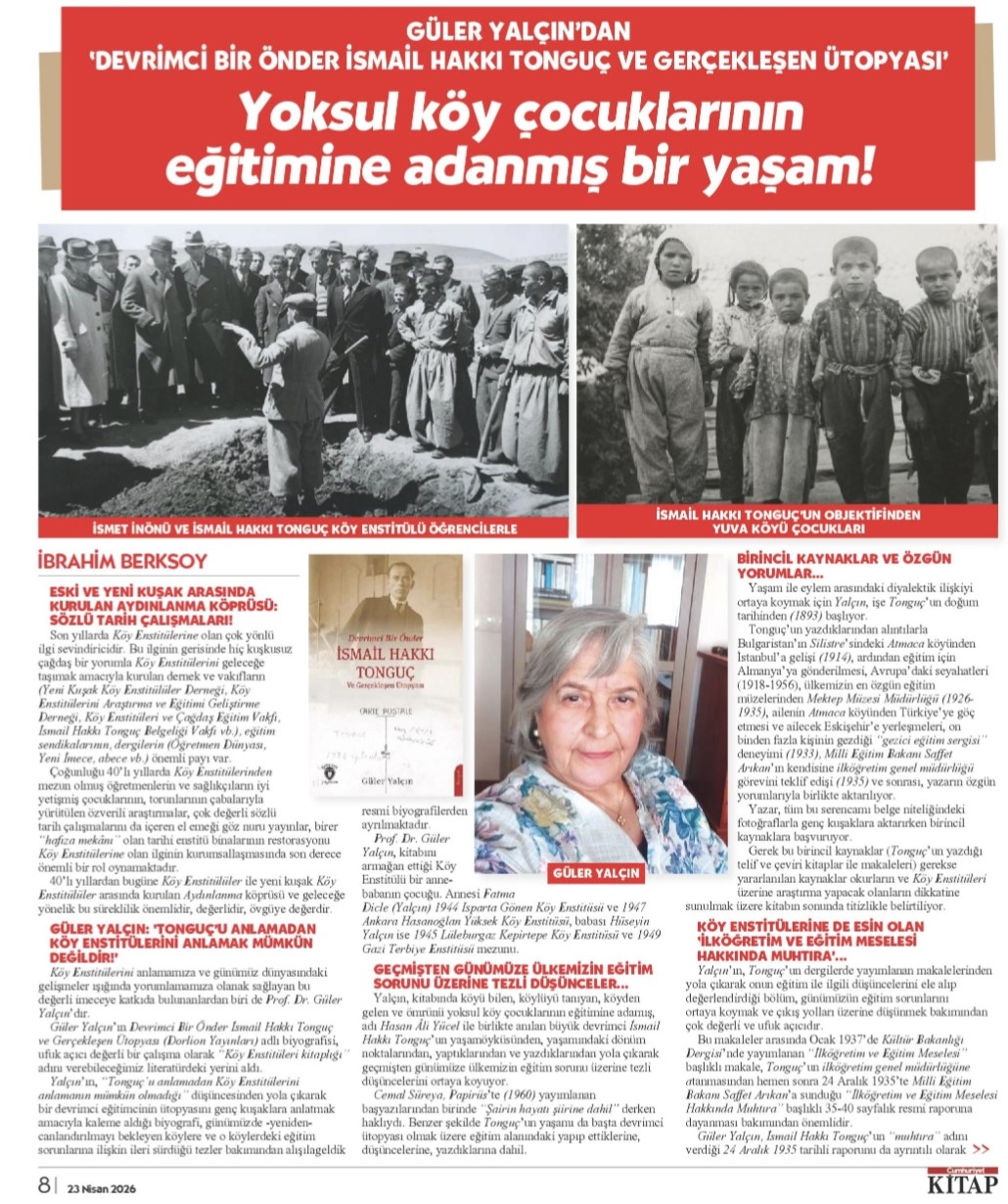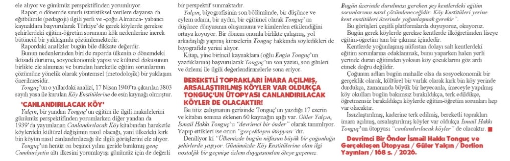 "Güler Yalçın kitabında bir yandan Tonguç’un eğitim ile ilgili makalelerini günümüz perspektifinden yorumlarken öte yandan da onun 1939’da yayımlanan Canlandırılacak Köy kitabından hareketle köylerdeki kültür değişimin nasıl olacağı yani ülkedeki kırk bin köyün nasıl canlandırılacağı ile ilgili görüşlerini ele alır. Tonguç’un henüz on beşinci yılını geride bırakmış genç cumhuriyetin altı ilkesini yorumlayışı günümüz için de değerli bir perspektif sunmaktadır."